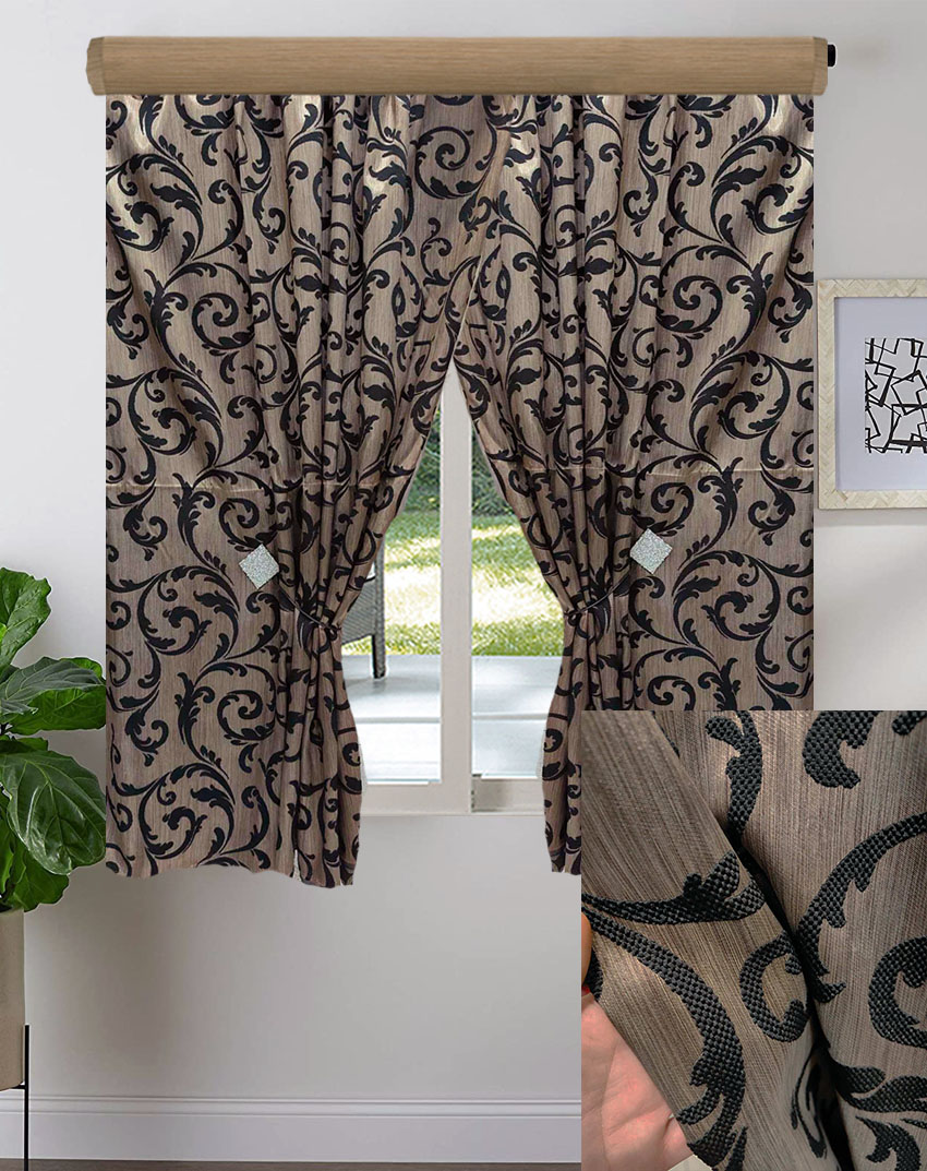 Κουρτίνα κοντή για παράθυρο. Είναι κουρτίνα σκίασης, χωρίς ορατότητα. Το ύφασμα είναι ταφτάς, χρώμα καφέ με μαύρο κλαδί. Οι κουρτίνες είναι ραμμένες με ελληνική τρέσα αντοχής ,6 εκ. συνεχομένη πιέτα.
