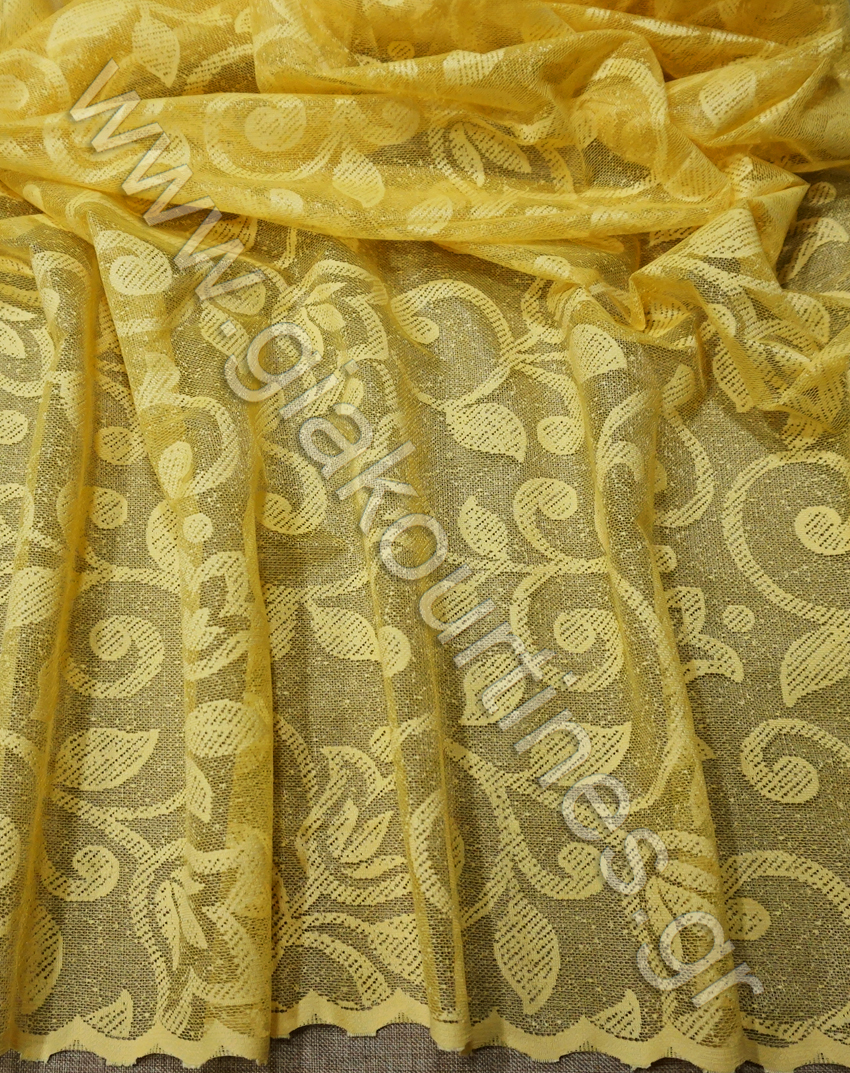 Ύφασμα δαντέλα διάφανη. Είναι σταθερό ύφασμα με φιστόνι στο τελείωμα. Το χρώμα της κουρτίνας είναι κίτρινο. Είναι ατσαλάκωτο ύφασμα. Μπορεί να χρησιμοποιηθεί ως κουρτίνα μόνη της ή σε συνδυασμό με κάποια πιο χοντρή ή ως ανάλαφρο ριντό.