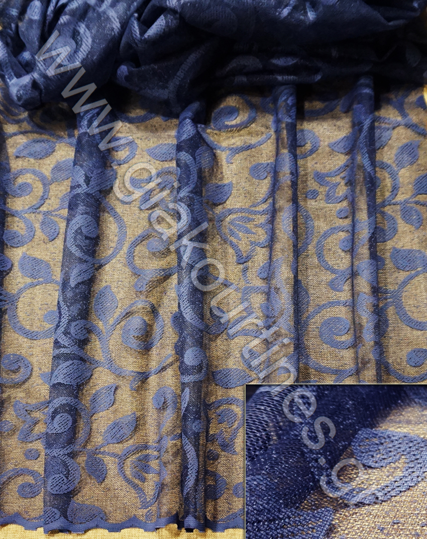 Ύφασμα δαντέλα διάφανη. Είναι σταθερό ύφασμα με φιστόνι στο τελείωμα. Το χρώμα της κουρτίνας είναι σκούρο μπλε. Είναι ατσαλάκωτο ύφασμα. Μπορεί να χρησιμοποιηθεί ως κουρτίνα μόνη της ή σε συνδυασμό με κάποια πιο χοντρή ή ως ανάλαφρο ριντό.