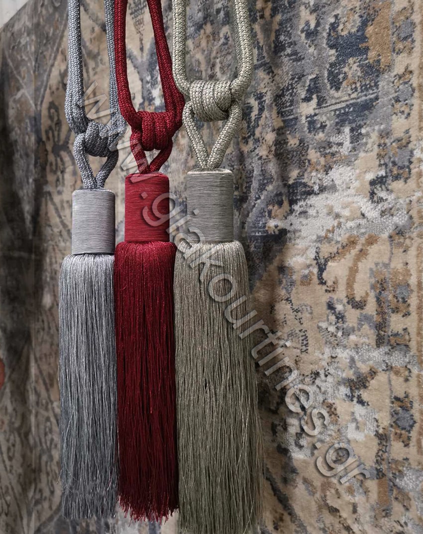 Χειροποιήτη φούντα για δέσιμο κουρτίνας. Διαθέσιμα χρώματα γκρι, μπορντό και γκριζολαδί.