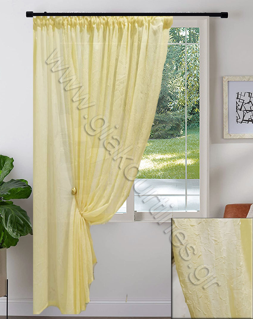 Κουρτινά μπαλκονόπορτας, έτοιμη ραμμένη. Κουρτίνα με διαφάνεια, ατσαλάκωτη γκοφρέ, χρώμα εκορύ κρεμ. Ράβονται στο εργαστήριο μας με ελληνική ποιοτική τρέσα. Οι διαστάσεις μπορούν να τροποποιηθούν.