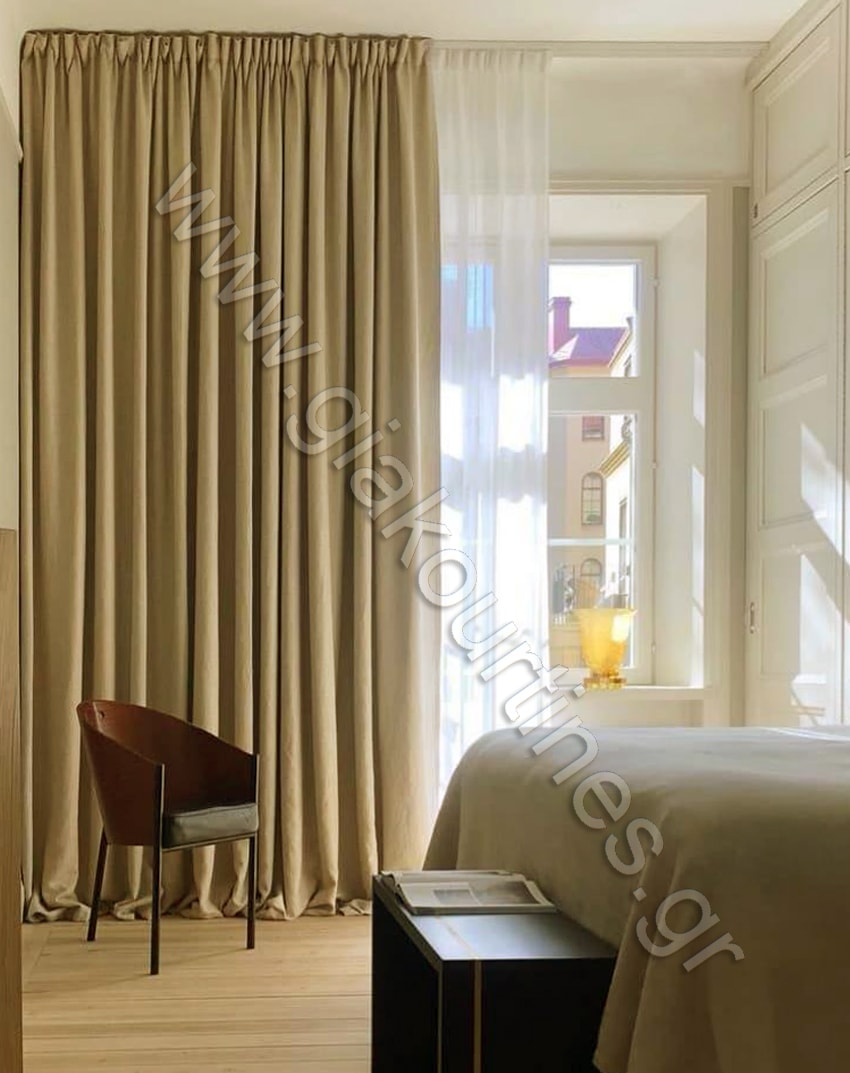 Κουρτίνα blackout τύπου λινό μπεζ, εσωτερική κουρτίνα λευκή