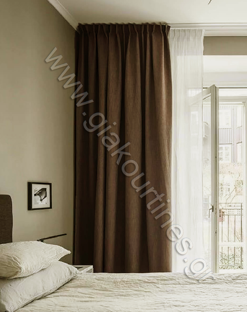 Κουρτίνα blackout τύπου λινό καφέ, εσωτερική κουρτίνα λευκή