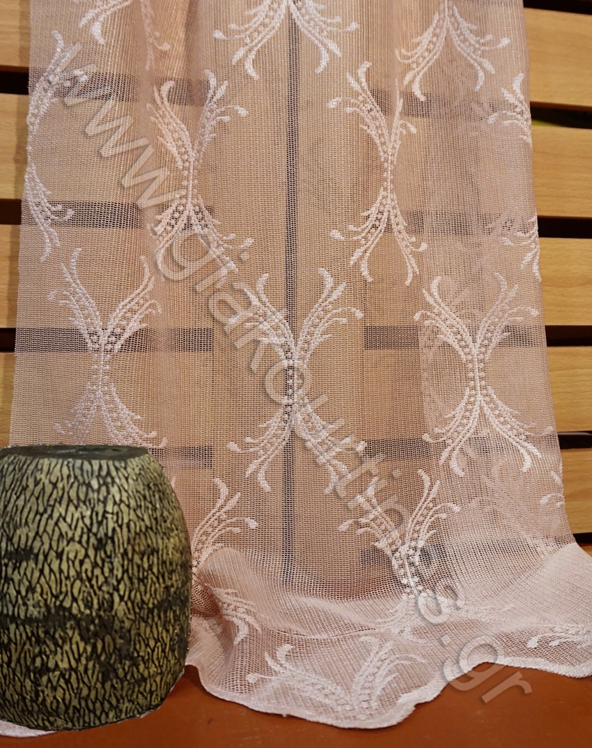 Κουρτίνα δαντέλα, διάφανη, ατσαλάκωτη. Είναι υφασμένη με εξαιρετικά νήματα και φιστόνι στο τελειώμα. Το χρώμα της κουρτίνας είναι ροζ πούδρας. Εξαιρετικά χυτό ύφασμα.