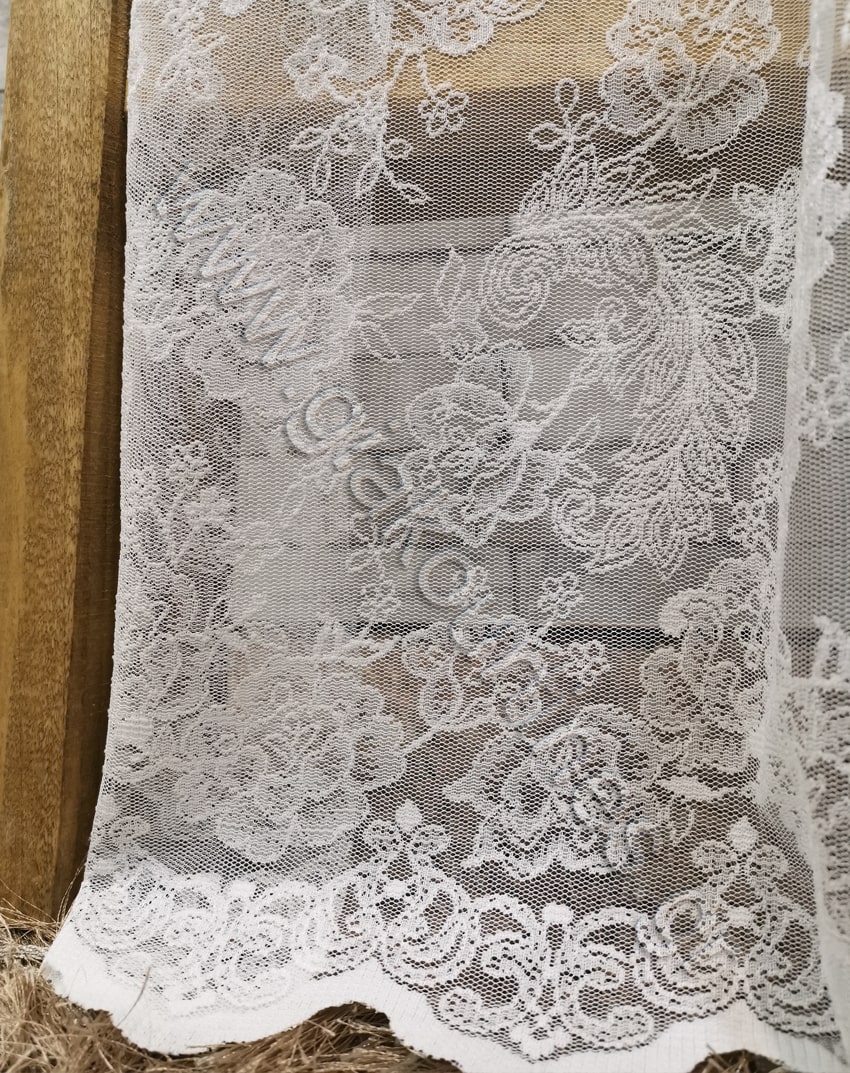 Ύφασμα για κουρτίνα , με διαφάνεια, Ευρωπαϊκών προδιαγραφών. Δαντέλα με ρομαντικό floral μοτίβο και φιστόνι στο τελείωμα. Το χρώμα της είναι υπόλευκο. Ατσαλάκωτο ύφασμα, δεν χρειάζεται καθόλου σίδερο.