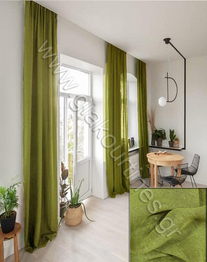 Κουρτίνα σταθερή γάζα, με διαφάνεια, έτοιμη ραμμένη. Εξαιρετικά χυτή, Ευρωπαίκών προτύπων και ποιότητας. Διαθέτει βαρίδι στο τελείωμα. Χρώμα λαδολαχανί.