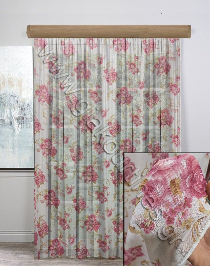 Κουρτίνα, με μερική διαφάνεια, έτοιμη ραμμένη. Χυτό ύφασμα, Ευρωπαίκών προτύπων και ποιότητας. Γάζα χρώμα ανοιχτό εκρού με λουλούδια.