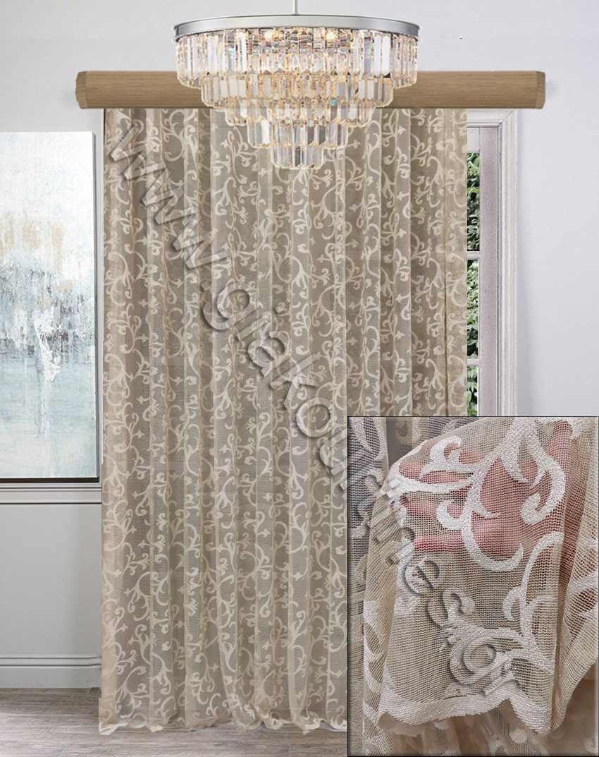 Κουρτίνα σταθερή δαντέλα, με εξαιρετικά νήματα και διαφάνεια, έτοιμη ραμμένη. Εξαιρετικά χυτή, Ευρωπαίκών προτύπων και ποιότητας. Διαθέτει φιστόνι στο τελείωμα με μοτίβο κλαδί. Είναι ατσαλάκωτο ύφασμα, χρώμα μπεζ γλυκό.