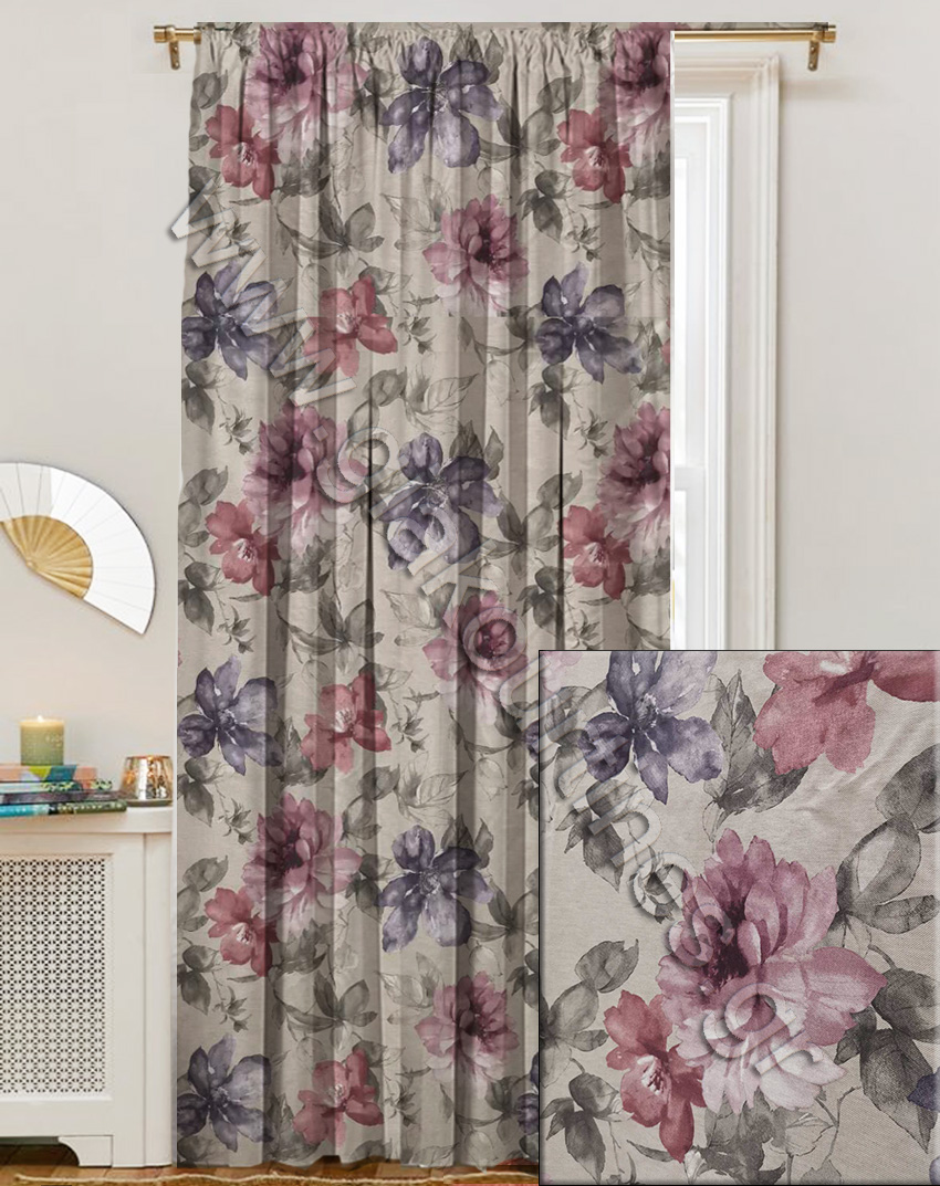Κουρτίνα σκίασης έτοιμη ραμμένη. Ύφασμα λονέτα Ισπανίας, τύπου καραβόπανο, χωρίς διαφάνεια, Ευρωπαίκών προτύπων και ποιότητας. Το χρώμα της κουρτίνας είναι απαλό γκρεζ, με floral μοτιβό χρώμα dusty pink, σάπιο μήλο και μπλέ παστέλ.