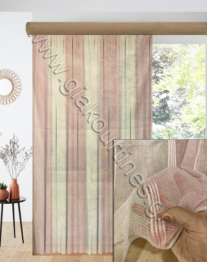 Κουρτίνα, με μερική διαφάνεια, έτοιμη ραμμένη. Χυτό ύφασμα, Ευρωπαίκών προτύπων και ποιότητας. Ατσαλάκωτη κουρτίνα με ρίγες ροζ και εκρού. Ατσαλάκωτο ύφασμα που δεν χρειάζεται σίδερο. Διαθέτει βαρίδι στο τελείωμα.