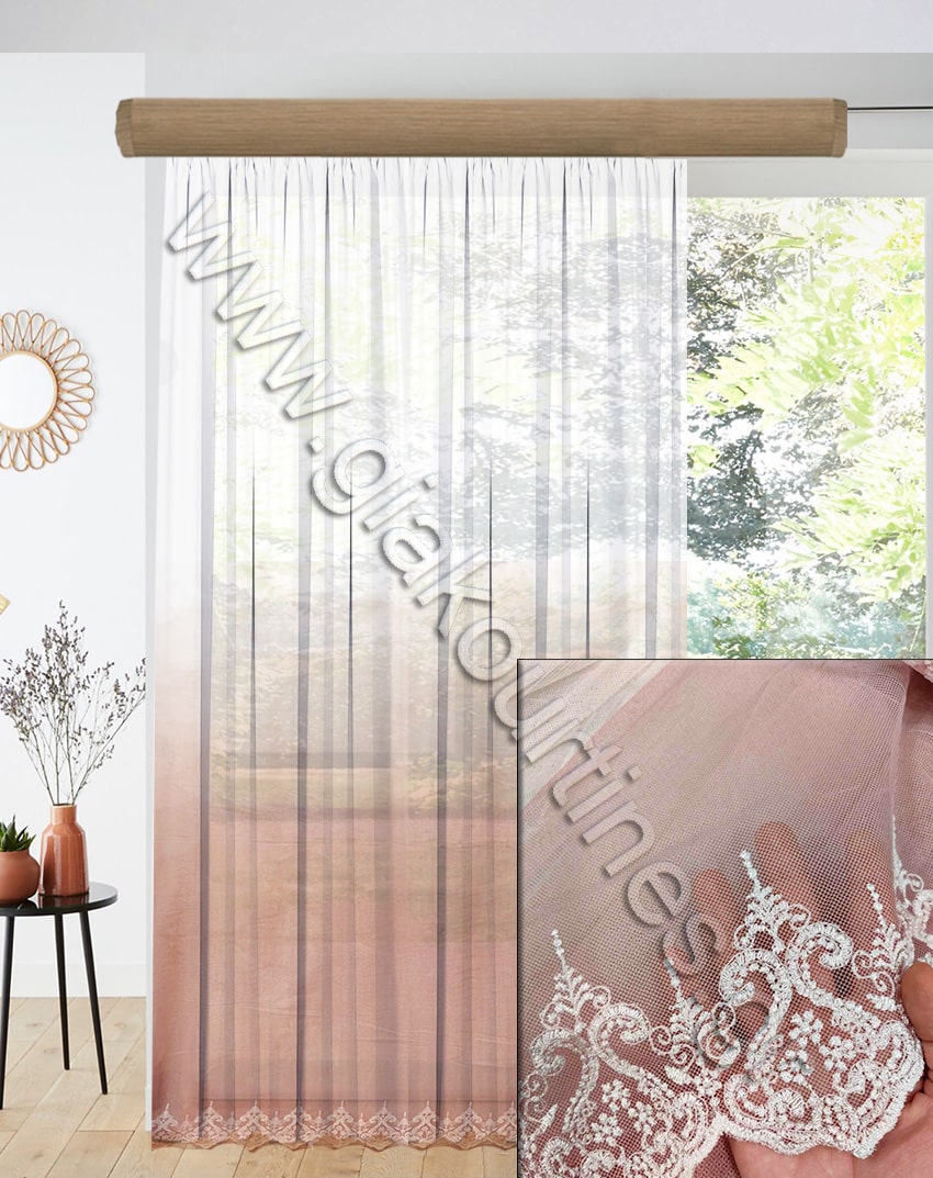 Κουρτίνα τούλινη σταθερή, με διαφάνεια, έτοιμη ραμμένη. Εξαιρετικά χυτή, Ευρωπαίκών προτύπων και ποιότητας. Διαθέτει κεντημένο φιστόνι τελείωμα. Είναι ατσαλάκωτο ύφασμα, χρώματος λευκό με Ombre ροζ σάπιο μήλο.
