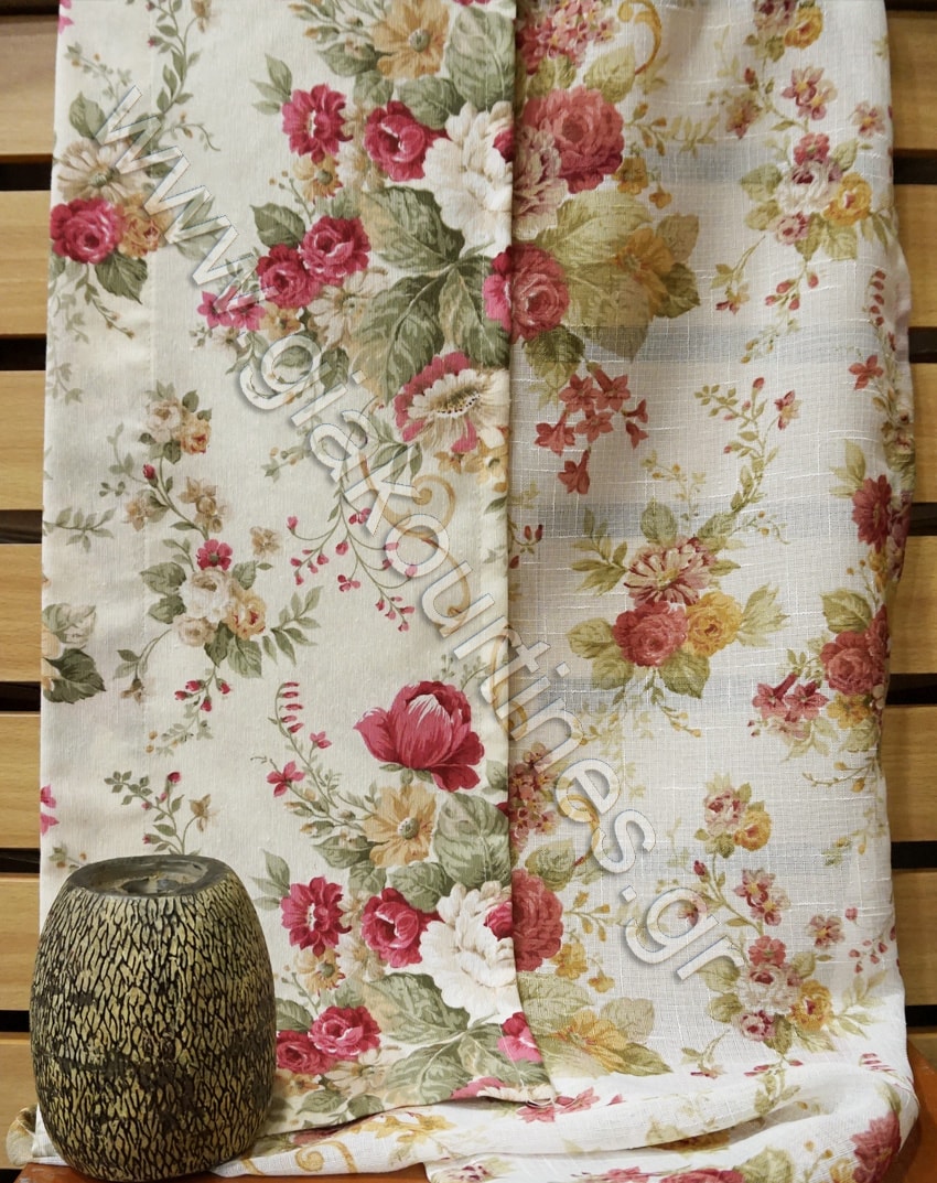 Κουρτίνα υπόλευκη με floral ρομαντικό σχέδιο. Διατίθεται σε λονέτα Ισπανίας χωρίς διαφάνεια και σε γάζα τύπου λινό με διαφάνεια.