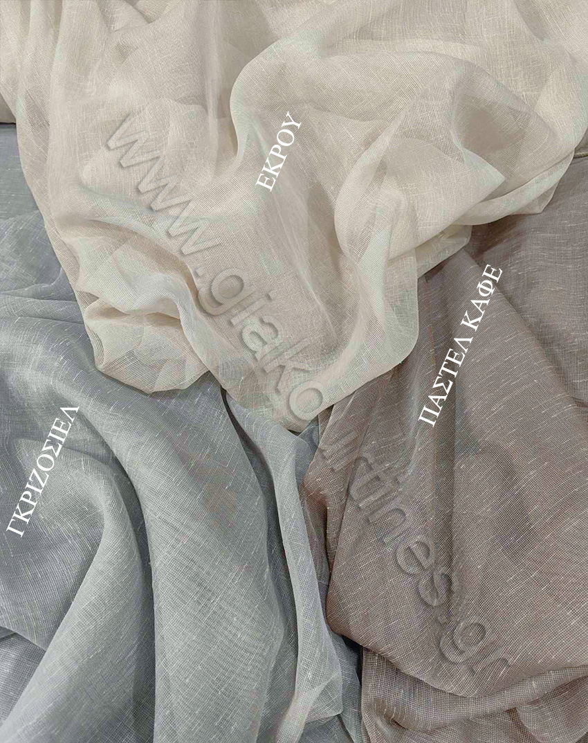 Ύφασμα για κουρτίνα , με διαφάνεια, Ευρωπαϊκών προδιαγραφών. Κουρτίνα χυτή ποιότητα γάζα. Διαθέσιμη σε εκρού, γκριζοσιελ και παστέλ καφέ. Διαθέτει βαρίδι στο τελείωμα.