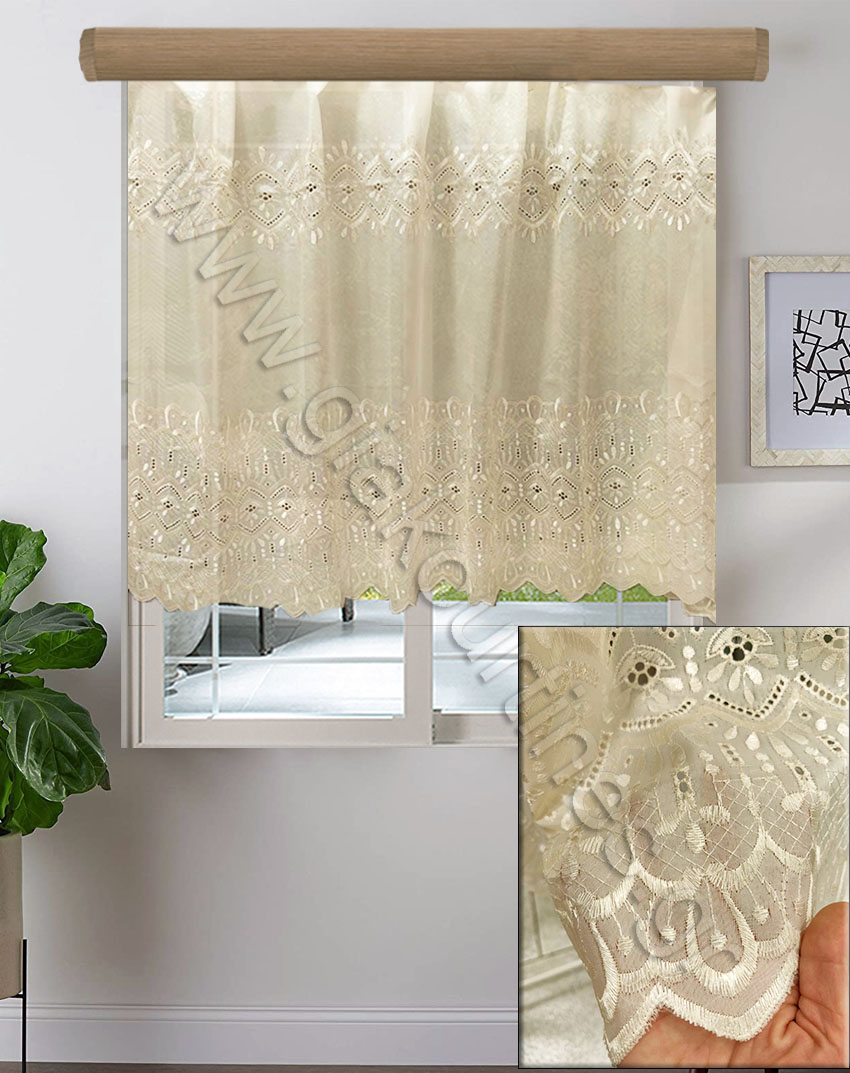 Κουρτινάκι για παράθυρο έτοιμο ραμμένο. Κουρτίνα κεντημένη με φιστόνι στο κάτω μέρος. Είναι ημιδιάφανο ματ ύφασμα, χρώμα εκρού προς μπεζ.