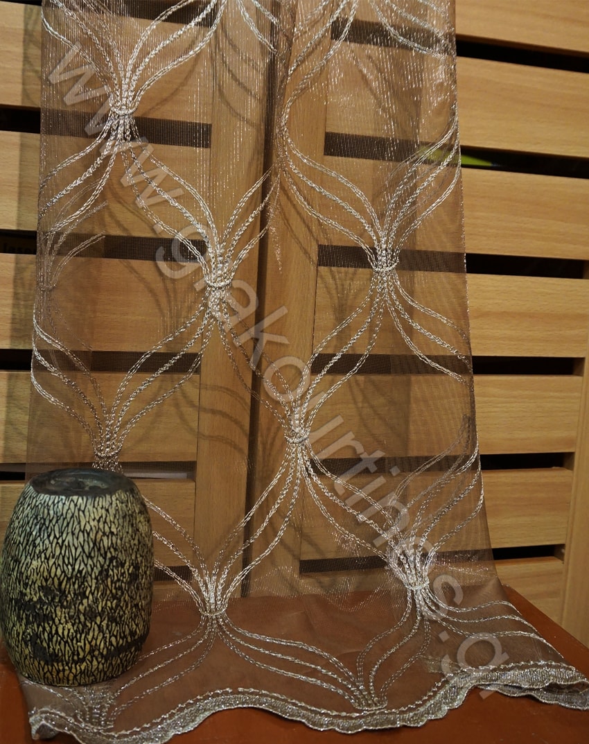 Κουρτίνα τούλινη οργαντίνα κεντημένη, διάφανη, ατσαλάκωτη. Είναι κουρτίνα ολοκέντητη, με φιστόνι στο τελειώμα. Το χρώμα της κουρτίνας είναι παστέλ σοκολά και κέντημα με κλωστή glitter. Εξαιρετικά χυτό ύφασμα.