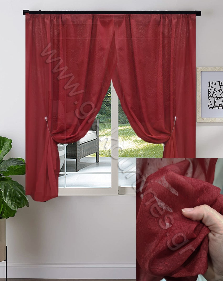 Κουρτίνα κοντή για παράθυρο. Είναι κουρτίνα με διαφάνεια, ποιότητα σαντούκ ζορζέτα. Το χρώμα της κουρτίνας είναι σκούρο κόκκινο.Οι κουρτίνες είναι ραμμένες με ελληνική τρέσα 6 εκ. συνεχομένη πιέτα.