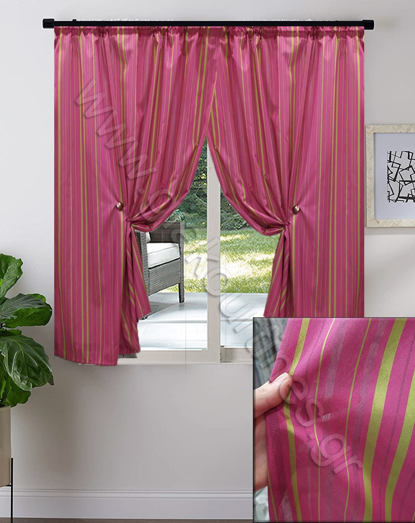 Κουρτίνα κοντή για παράθυρο. Είναι κουρτίνα σκίασης, ποιότητα ταφτάς. Το χρώμα της κουρτίνας είναι φουξ με λαχανί ρίγες. Οι κουρτίνες είναι ραμμένες με ελληνική τρέσα 6 εκ. συνεχομένη πιέτα.
