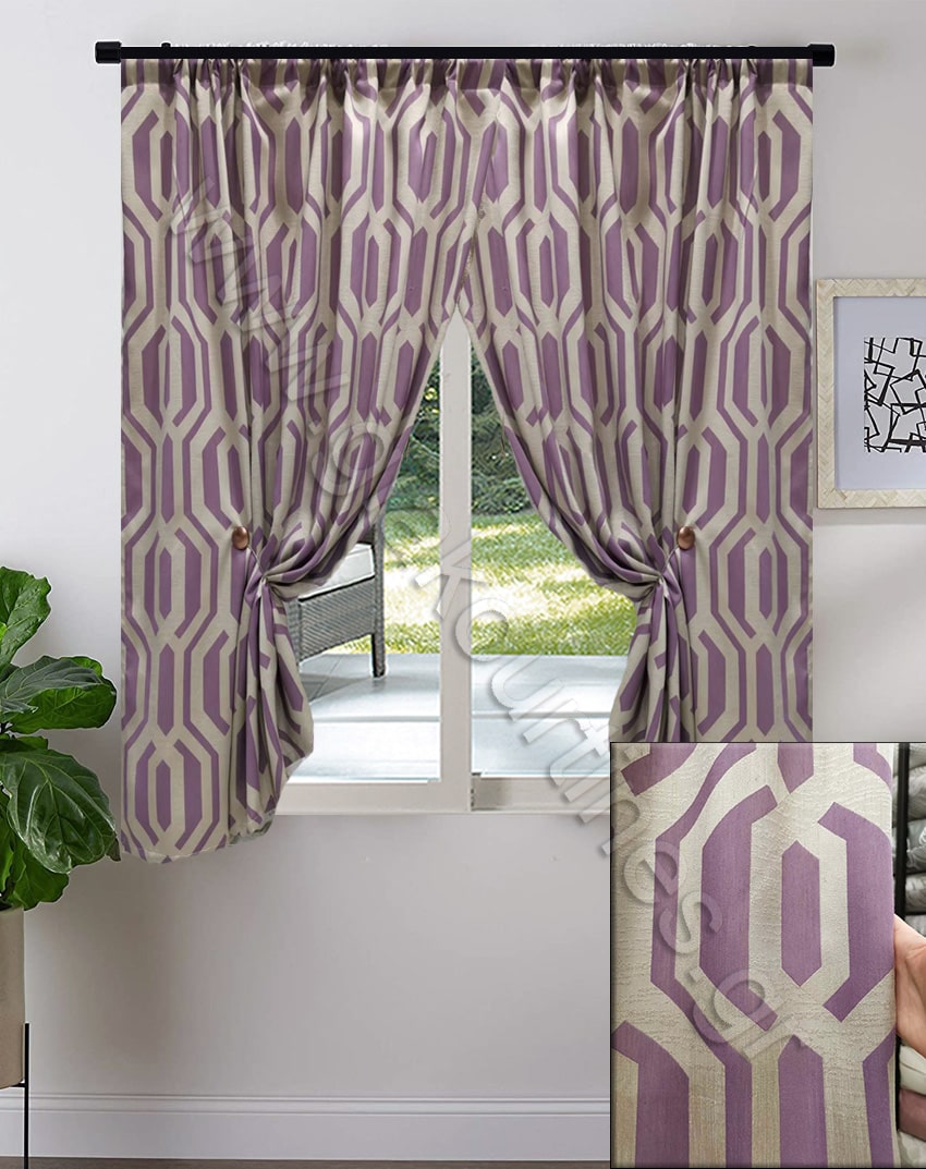 Κουρτίνα κοντή για παράθυρο. Είναι κουρτίνα σκίασης, χωρίς ορατότητα. Το ύφασμα είναι ματ, σε αποχρώσεις του παστέλ μωβ με μοντέρνο μοτίβο χρώμα γκρεζ. Οι κουρτίνες είναι ραμμένες με ελληνική τρέσα αντοχής ,6 εκ. συνεχομένη πιέτα.