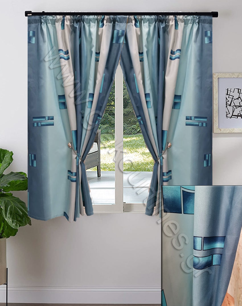 Κουρτίνα κοντή για παράθυρο. Είναι κουρτίνα σκίασης, χωρίς ορατότητα. Το ύφασμα είναι ματ, πετροπλυμένο σε αποχρώσεις του σιελ μπλε. Οι κουρτίνες είναι ραμμένες με ελληνική τρέσα 6 εκ. συνεχομένη πιέτα.