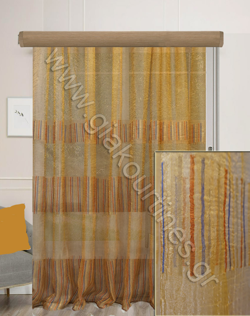 Κουρτίνα με διαφάνεια, μπρονζέ ατσαλάκωτη με ρίγες. Διαθέτει βαρίδι στο τελείωμα.Στην συγκεκριμένη κατηγορία αγοράζετε φάρδος υφάσματος