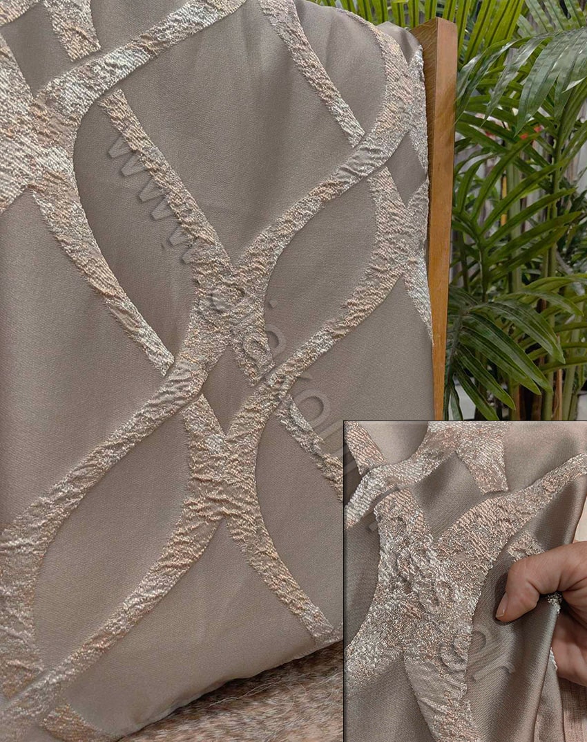 Ύφασμα για κουρτίνα, χωρίς διαφάνεια, ύφασμα ζακάρ ταφτάς ματ, Ευρωπαϊκών προτύπων. Το χρώμα της κουρτίνας είναι γκρεζ με μοτίβο μπεζ και γκρι απαλό του πάγου.