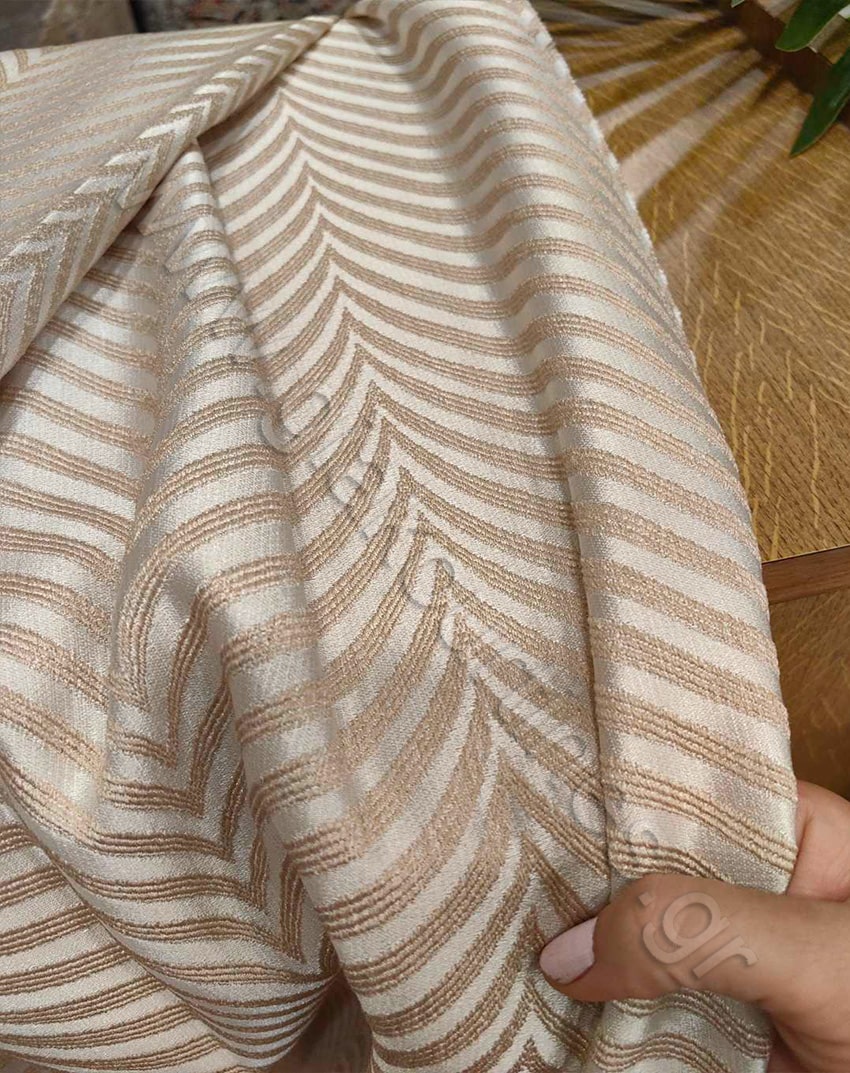 Ύφασμα για κουρτίνα, χωρίς διαφάνεια, ύφασμα ζακάρ ταφτάς ματ, Ευρωπαϊκών προτύπων. Το χρώμα της κουρτίνας είναι ιβουάρ με σχέδιο ψαροκόκκαλο μπεζ.