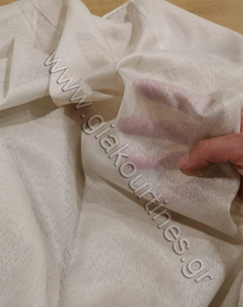 Ύφασμα ματ, με διαφάνεια και βαρίδι στο τελείωμα. Είναι σταθερό ύφασμα και μαλακό. Το χρώμα του είναι μπεζ natural ουδέτερο.