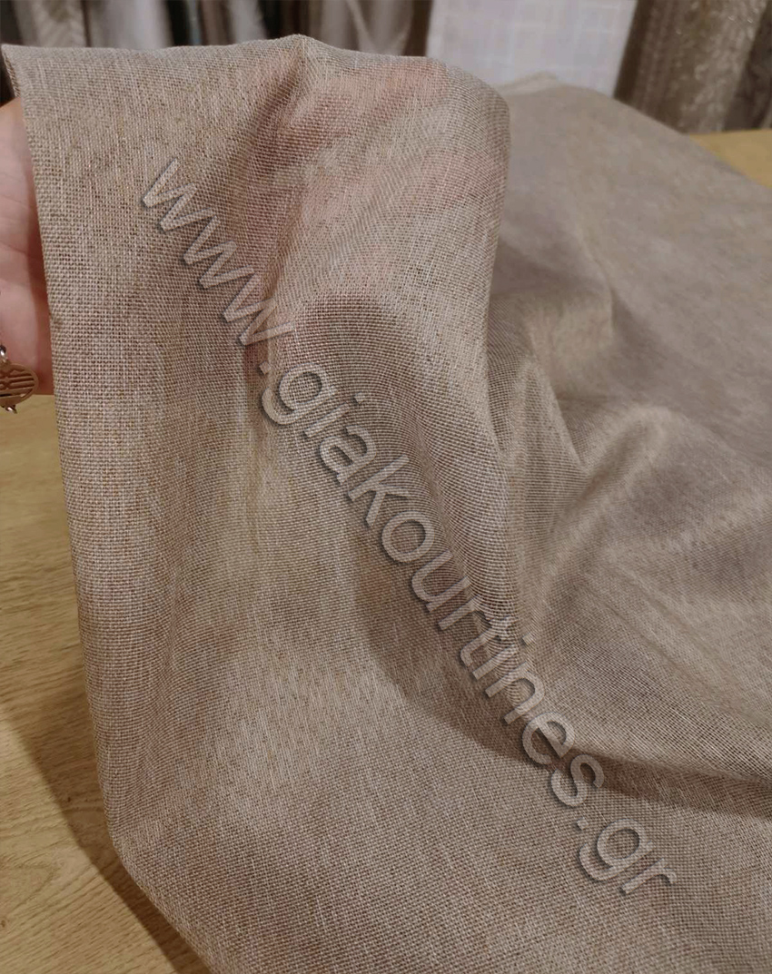 Ύφασμα ματ, με διαφάνεια και βαρίδι στο τελείωμα. Είναι σταθερό ύφασμα και μαλακό. Το χρώμα του είναι ουδέτερο παστέλ καφέ.