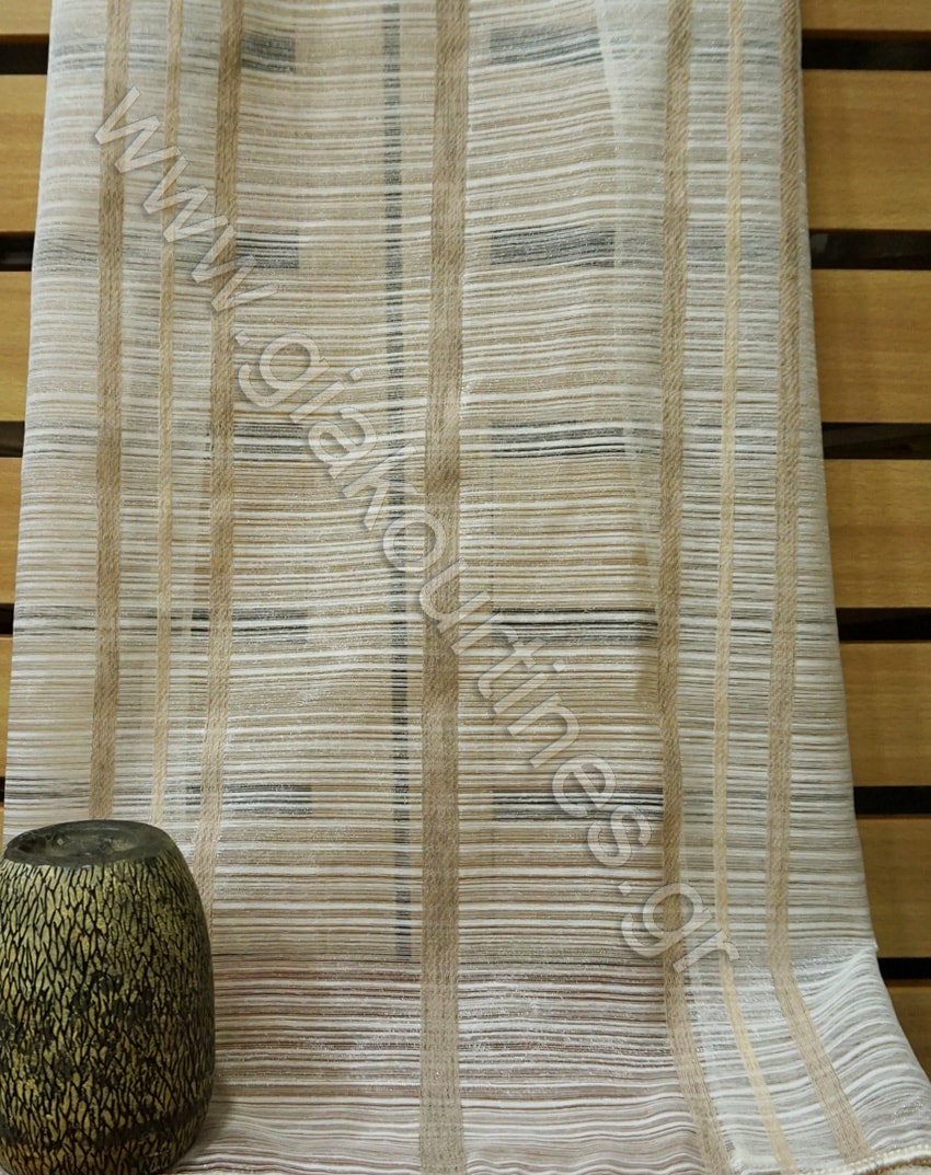 Κουρτίνα οργάντζα, διάφανη, με βαρίδι στο τελείωμα. Το χρώμα της κουρτίνας είναι υπόλευκο με ρίγες απαλό καφέ.