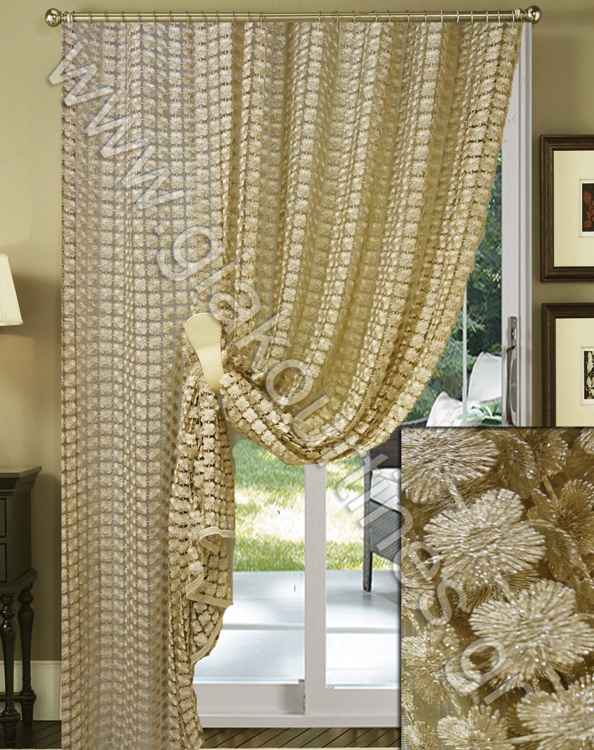 Κουρτίνα διάφανη έτοιμη ραμμένη, δίχτυ πολυτελείας. Το χρώμα της είναι μπεζοχρυσό με κλωστή glitter. Είναι χυτή κουρτίνα που δεν χρειάζεται σίδερο.