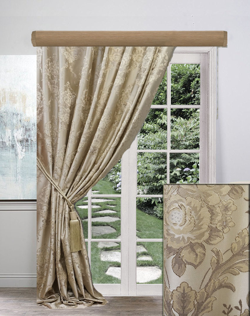 Ριντό αδιάφανο, ταφτάς σατινέ, πολυτελείας ανάγλυφος. Είναι χυτό ύφασμα, με μπαρόκ σχέδια τριαντάφυλλα και κλωστή glitter στο κέντρο τους. Το χρώμα της κουρτίνας είναι μπεζ εκρού.