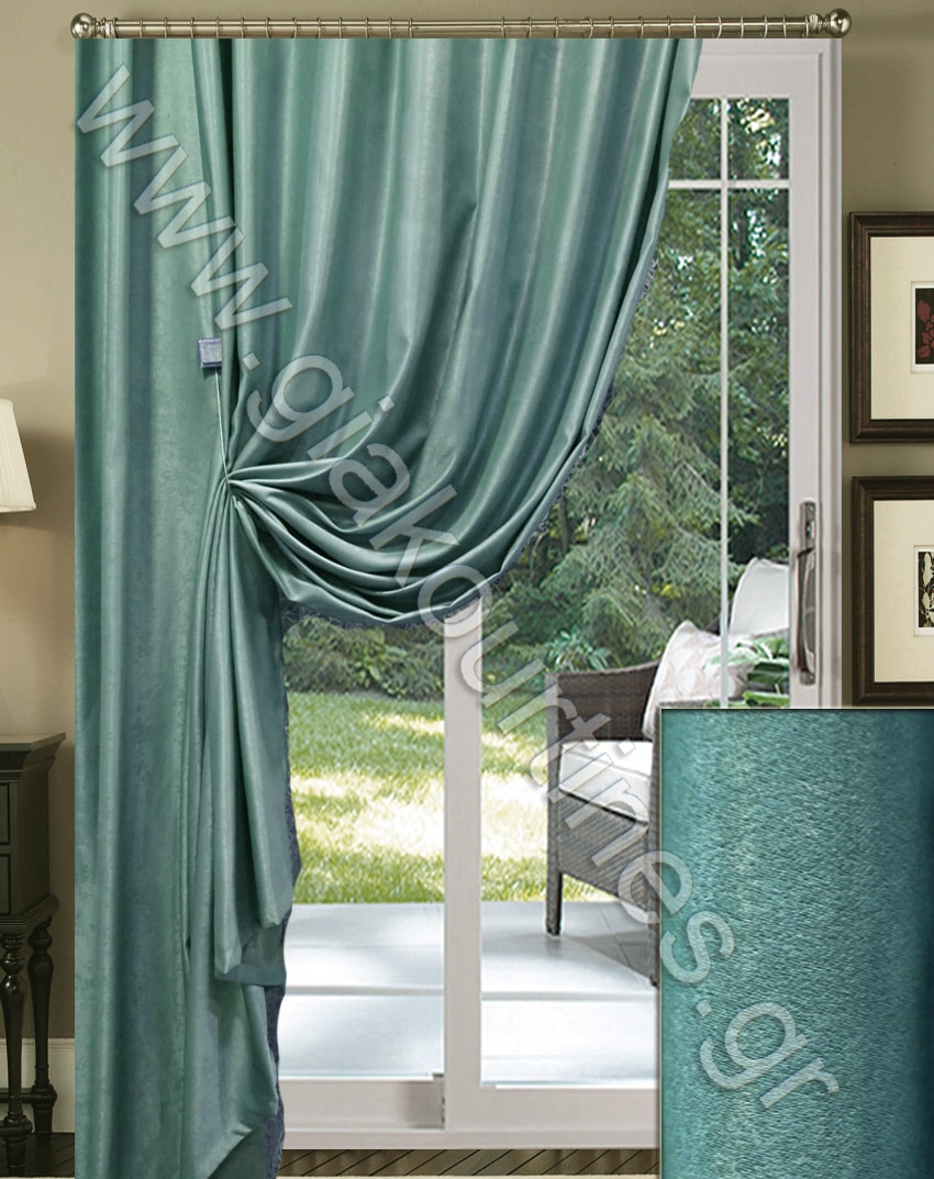 Ριντό αδιάφανο, βελούρ. Είναι χυτό και μαλακό ύφασμα. Το χρώμα του είναι απαλό τυρκουάζ.