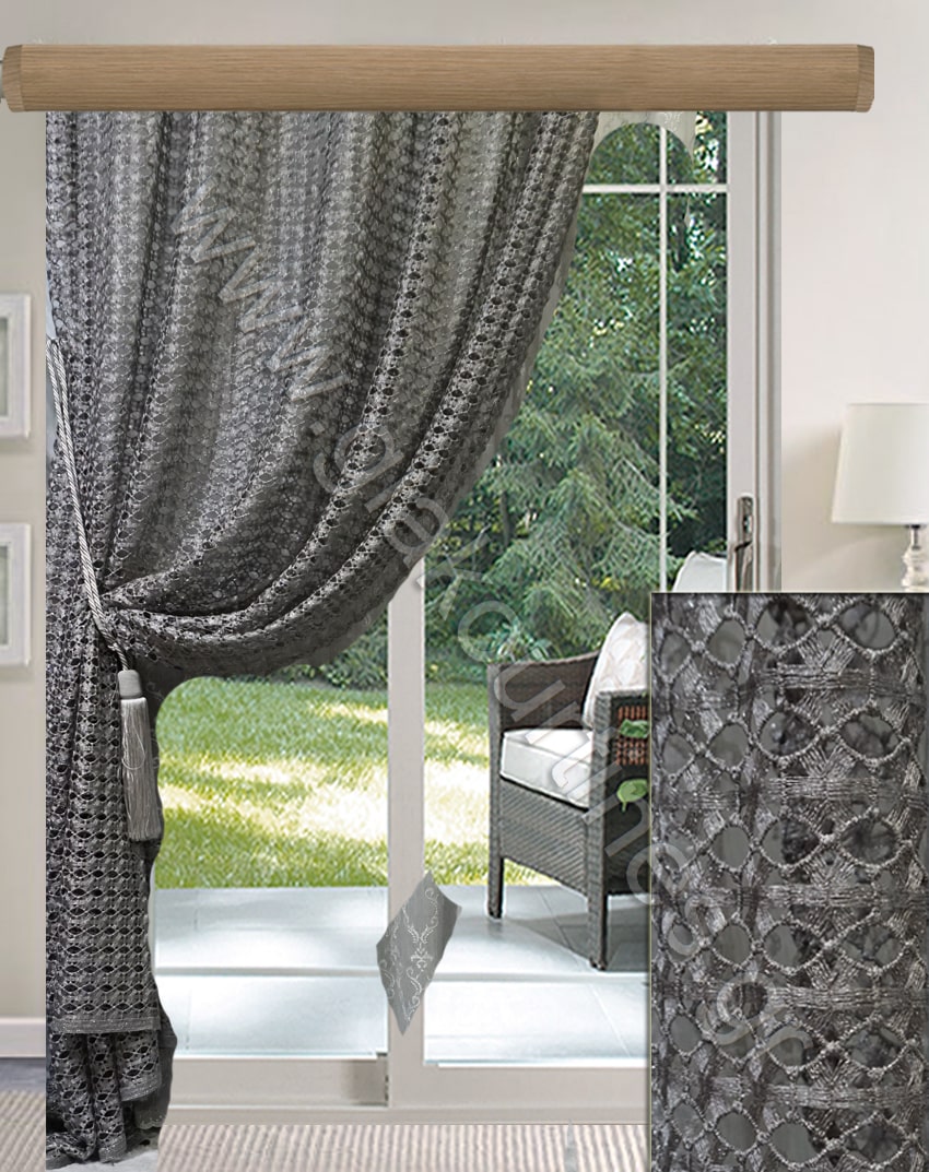 Κουρτίνα βαριά, κιπούρ διάφανη. Είναι χυτό και ατσαλάκωτο ύφασμα. Το χρώμα της κουρτίνας είναι γκρι με ασημί κλωστή glitter. Η κουρτίνα αυτή δεν χρειάζεται σίδερο. Μπορεί να χρησιμοποιηθεί ως κουρτίνα μόνη της ή σε συνδυασμό με κάποια πιο χοντρή, ριντό ή και ως ριντό πάνω από κουρτίνα.