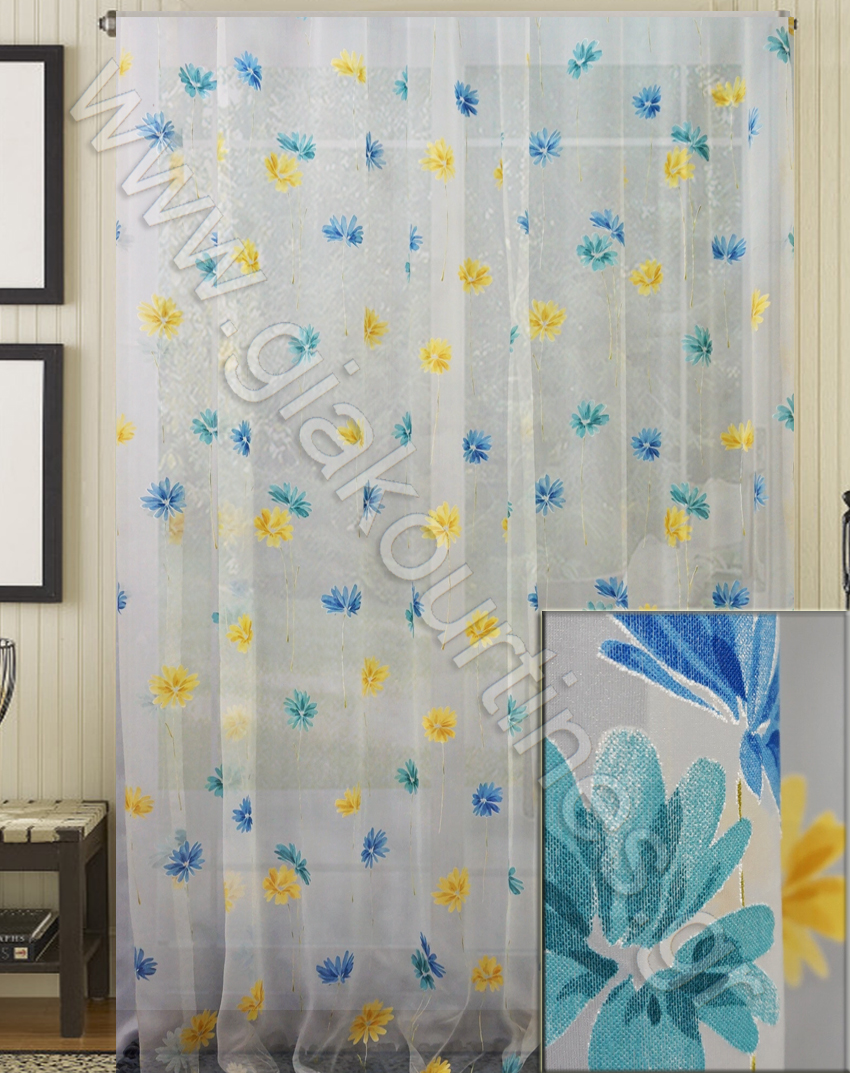 Κουρτίνα ραμμένη διάφανη, οργάντζα ντεβορέ. Είναι χυτό και σταθερό ύφασμα με βαρίδι στο τελείωμα. Το χρώμα της κουρτίνας είναι υπόλευκο με λουλούδια τυρκουάζ, μπλε και κίτρινα. Μπορεί να χρησιμοποιηθεί ως κουρτίνα μόνη της ή σε συνδυασμό με κάποια πιο χοντρή ή ως ανάλαφρο ριντό.
