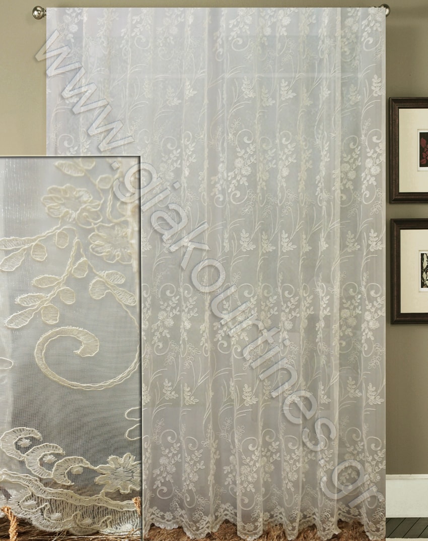 Κουρτίνα ραμμένη τούλινη οργαντίνα εξαιρετικής ποιότητας. Είναι χυτό ύφασμα ολοκέντητο με φιστόνι στο τελείωμα. Το χρώμα της κουρτίνας είναι υπόλευκο με υπόλευκο κέντημα. Δεν χρειάζεται καθόλου σίδερο.