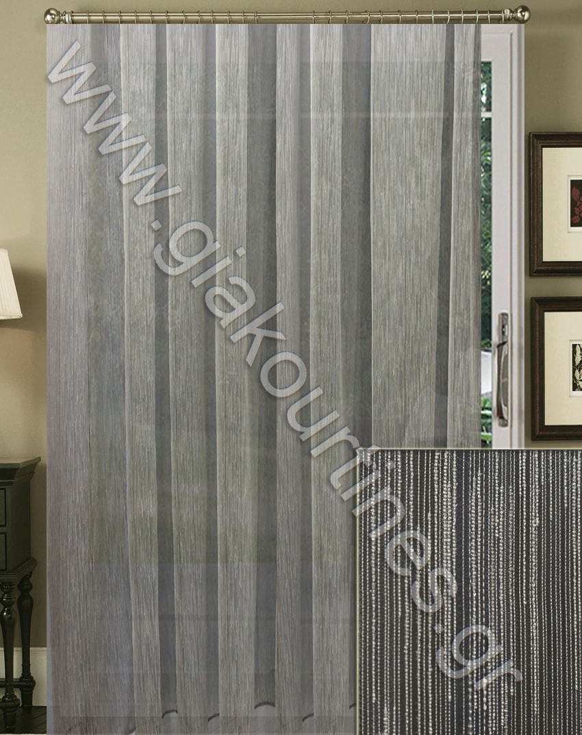 Κουρτίνα διάφανη ποιότητα φλάμα. Το χρώμα της κουρτίνας είναι γκρι.Μπορεί να χρησιμοποιηθεί ως κουρτίνα μόνη της ή σε συνδυασμό με κάποια πιο χοντρή ή ως ανάλαφρο ριντό.