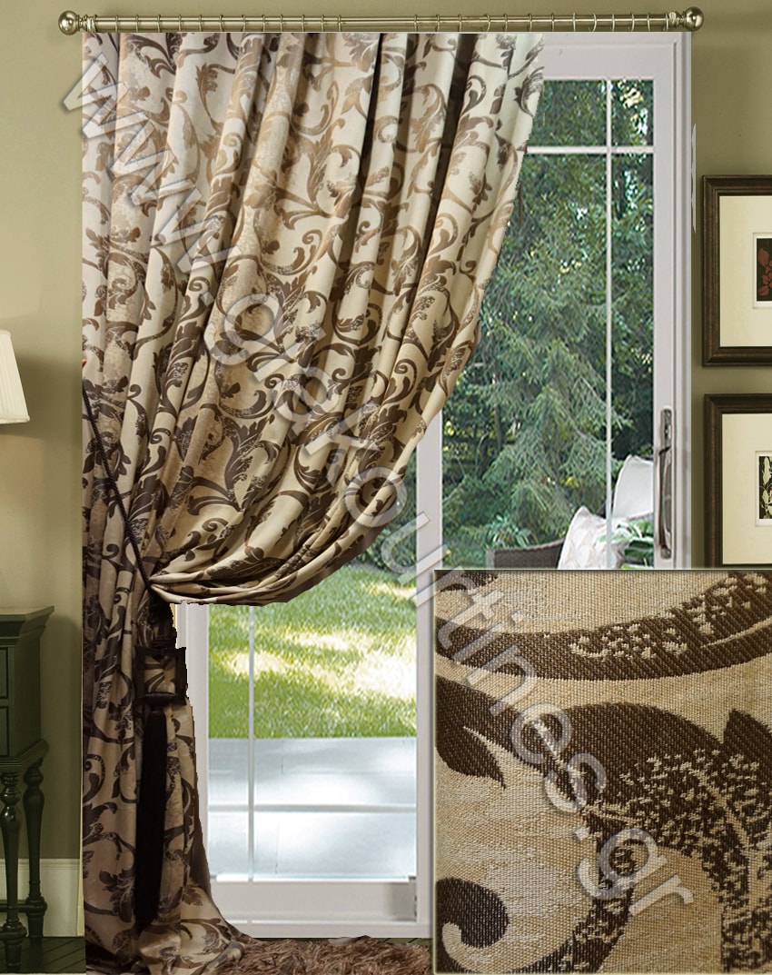 Ριντό αδιάφανο ραμμένο. Είναι εξαιρετικά χυτό και μαλακό ύφασμα με σχέδιο μπαρόκ κλαδάκι. Το χρώμα της κουρτίνας είναι μπεζ με μπαρόκ χρώμα καφέ. Μπορεί να χρησιμοποιηθεί μόνη της, ως κουρτίνα σκίασης ή σε συνδυασμό με κάποια πιο λεπτή, ως ριντό ή ως ρόμαν πακέτο.
