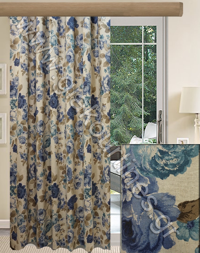 Ριντό αδιάφανο ραμμένο, λονέτα Ισπανίας εξαιρετικής ποιότητας. Το χρώμα της κουρτίνας είναι ουδέτερο της άμμου με μπλε σιέλ λουλούδια. Μπορεί να χρησιμοποιηθεί μόνη της, ως κουρτίνα σκίασης ή σε συνδυασμό με κάποια πιο λεπτή, ως ριντό ή ως ρόμαν πακέτο.