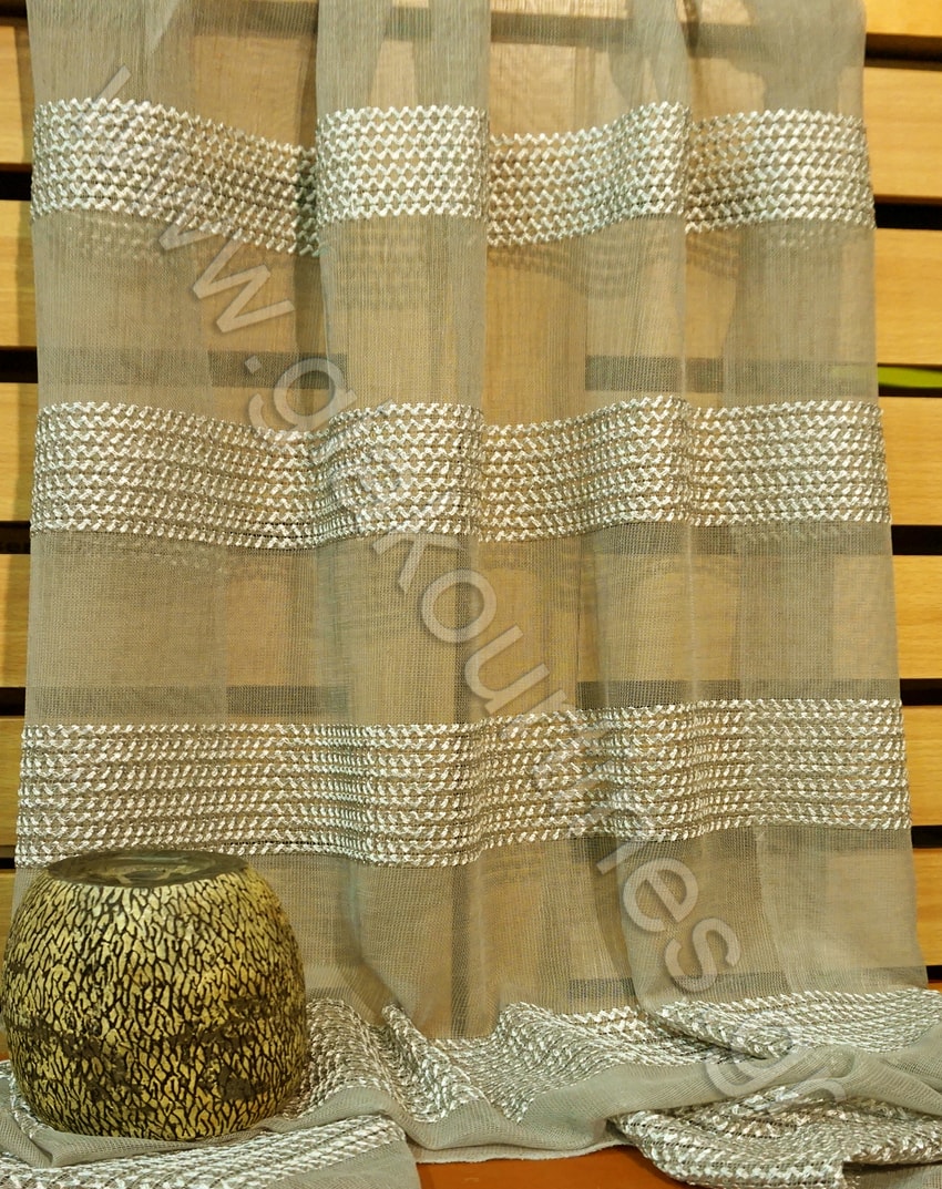 Κουρτίνα ματ πολυτελείας, τύπου λινό, διάφανη. Είναι μοντέρνα, χυτή κουρτίνα, με βαρίδι στο τελειώμα. Το χρώμα της κουρτίνας είναι smokey μπεζ με κεντημένες μπεζ ρίγες (6 ρίγες).