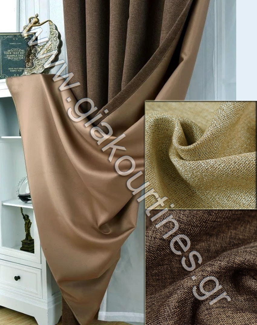 Κουρτίνα blackout συσκότισης έτοιμη ραμμένη, διαθέσιμο σε μπεζοεκρού και καφέ. Έχει ύφανση τύπου λινό, που το κάνει διαφορετικό από τα κοινά blackout. Ματ ύφασμα Ευρωπαϊκών προδιαγραφών, διαθέτει τριπλή στρώση υφασμένης κλωστής, για καλύτερη απόδοση. Παρέχει στον χώρο 95% συσκότιση, ώστε ο επισκέπτης να κοιμάται ανενόχλητος στον χώρο.