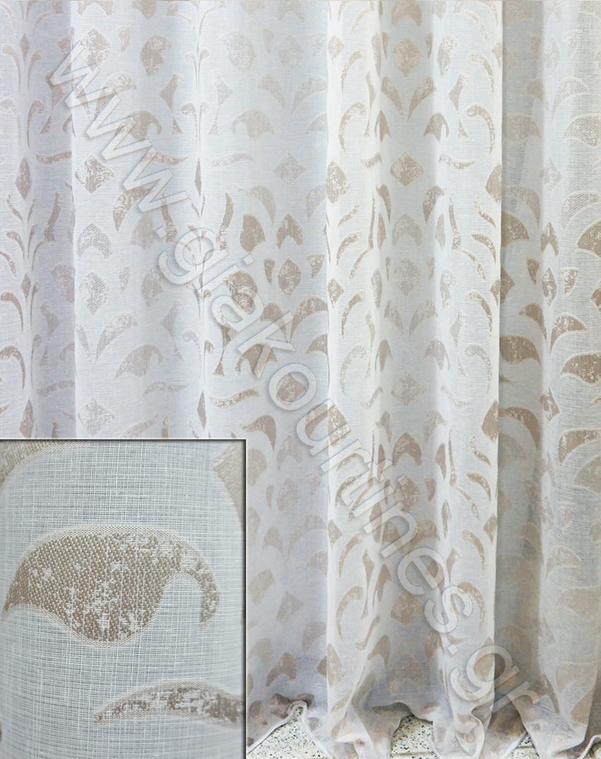 Κουρτίνα τύπου λινό πολυέστερ με ματ υφή, ημιδιάφανη. Μοντέρνο ύφασμα ατσαλάκωτο, με σχέδιο φιλ κουπέ φύλλα. Το χρώμα της κουρτίνας είναι υπόλευκo και τα φύλλα μπεζ.Μπορεί να χρησιμοποιηθεί ως κουρτίνα μόνη της ή σε συνδυασμό με κάποια πιο χοντρή, ριντό.