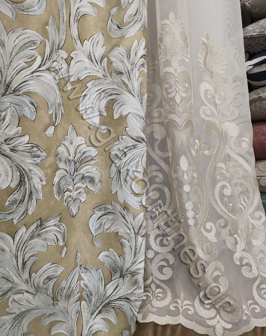 Κουρτίνα σκίασης έτοιμη ραμμένη. Ύφασμα λονέτα Ισπανίας, , χωρίς διαφάνεια, Ευρωπαίκών προτύπων και ποιότητας. Το χρώμα της κουρτίνας είναι μπεζ, με vintage μπαρόκ κοκκαλί μοτίβο.