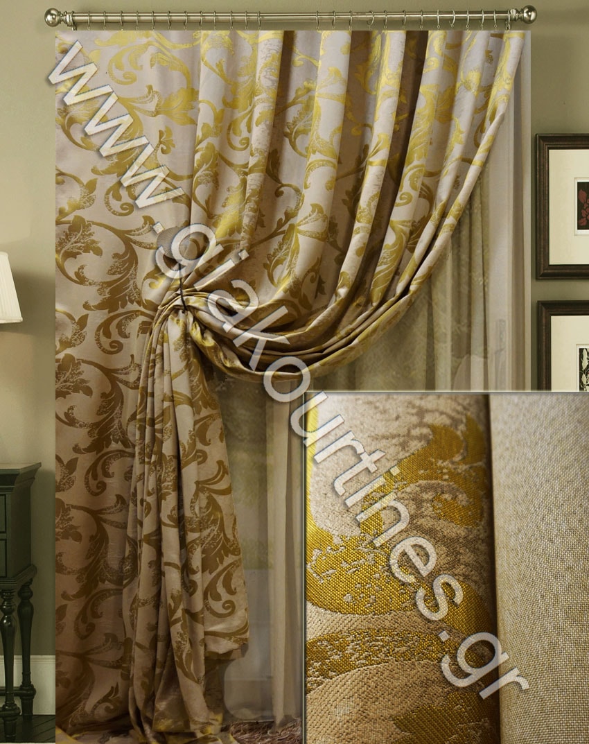 Ριντό αδιάφανο ραμμένο. Ύφασμα πολυτελείας, μπαρόκ, εξαιρετικά χυτό και μαλακό. Το χρώμα της κουρτίνας είναι μπεζ με μπαρόκ χρώμα χρυσολαδί.