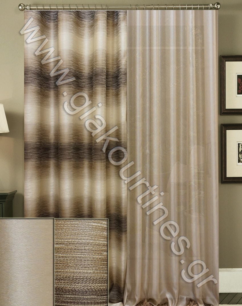 Ριντό αδιάφανο ραμμένο, ταφτάς πολυτελείας με σατινέ απαλή υφή. Είναι χυτό ύφασμα με ρίγες. Το χρώμα της κουρτίνας είναι μπεζ, μόκα και αποχρώσεις του καφέ.