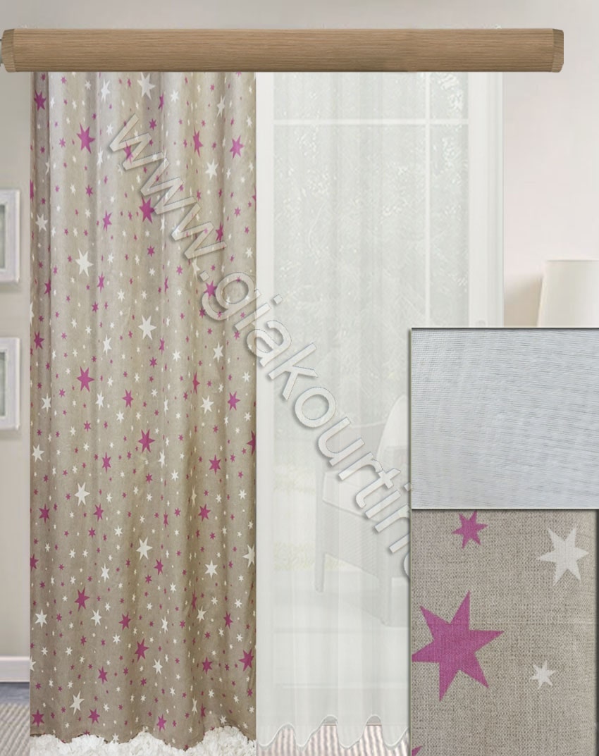 Ριντό αδιάφανο ραμμένο, λονέτα Ισπανίας. Το χρώμα της κουρτίνας είναι ουδέτερο ανοιχτό παλ γκρι με αστεράκια λιλά προς ροζ και υπόλευκα.