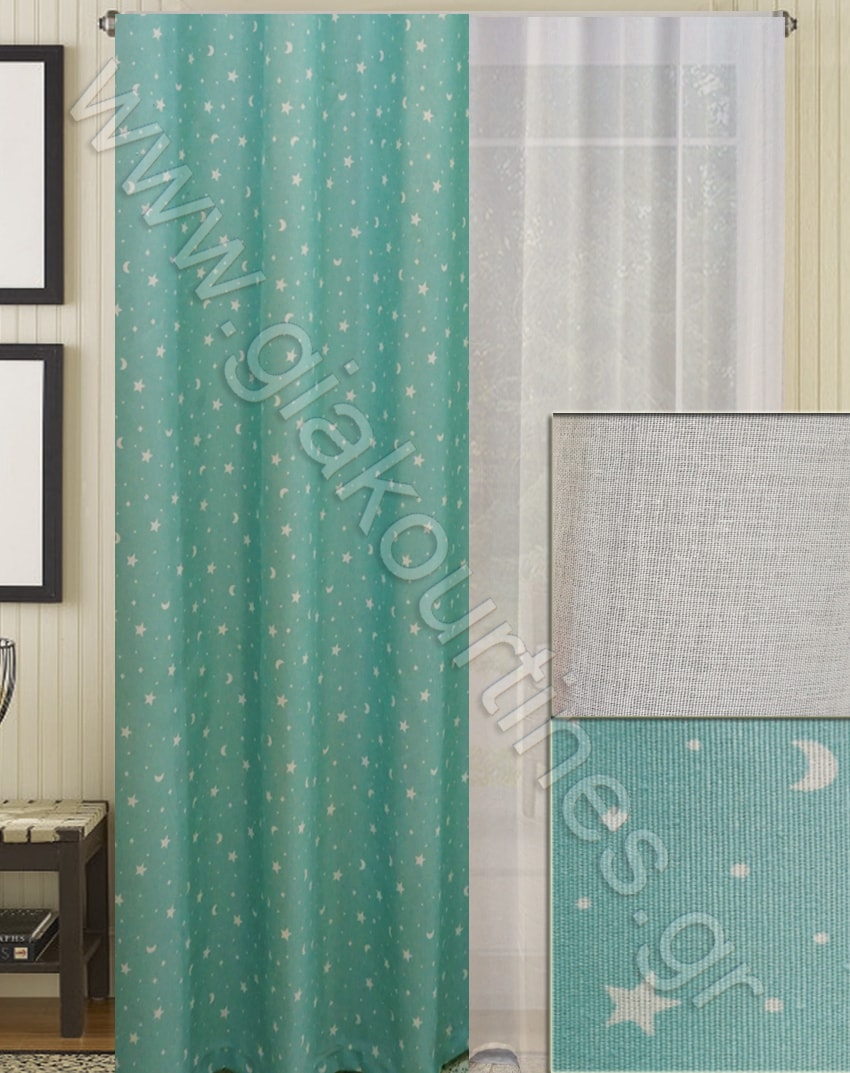 Ριντό αδιάφανο ραμμένο, λονέτα Ισπανίας. Το χρώμα της κουρτίνας είναι aqua με αστεράκια και φεγγαράκια του πάγου.