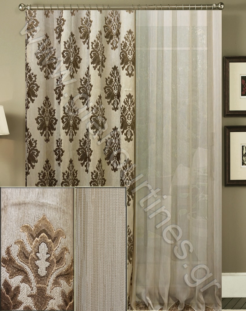 Ριντό αδιάφανο ραμμένο σενίλ. Είναι ανάγλυφο ύφασμα , το χρώμα της κουρτίνας είναι ουδέτερο μπεζ με μπαρόκ μοτίβα σε αποχρώσεις σοκολά μπρονζέ.