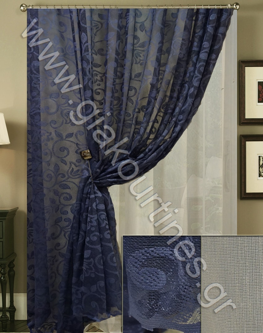 Ριντό ανάλαφρη δαντέλα διάφανη. Είναι σταθερό ύφασμα με φιστόνι στο τελείωμα. Το χρώμα της κουρτίνας είναι σκούρο μπλε. Είναι ατσαλάκωτο ύφασμα.