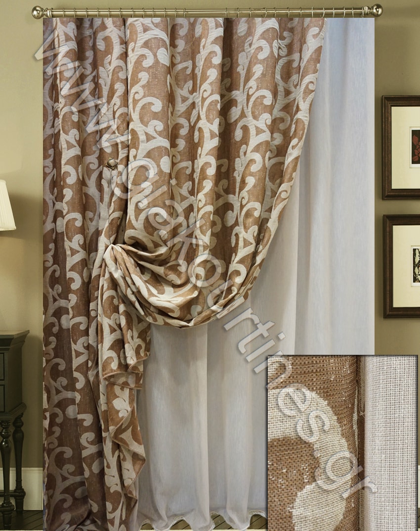 Ριντό αδιάφανο με ύφανση λινού, ποιότητα πολυέστερ. Είναι ύφασμα διπλής όψεως. Το χρώμα του είναι σοκολά, με μπεζ της άμμου μπαρόκ κλαδάκια.