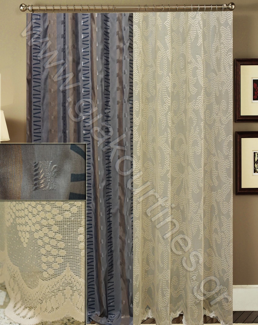 ΚΟΥΡΤΙΝΕΣ ΡΑΜΜΕΝΕΣ ΣΕΤ, ΡΙΝΤΟ ΓΚΡΙ ΣΙΕΛ ΜΕ ΜΠΕΖ ΡΙΓΑ 2,50Μ ΦΑΡΔΟΣ, ΚΟΥΡΤΙΝΑ ΔΑΝΤΕΛΑ ΑΤΣΑΛΑΚΩΤΗ ΜΠΕΖ 4Μ ΦΑΡΔΟΣ Χ 2,80Μ ΥΨΟΣ